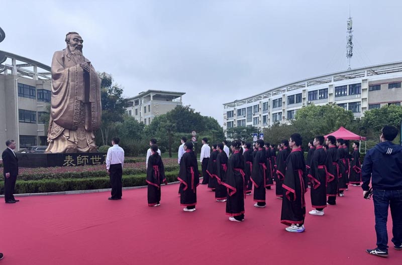 上午9時28分,典禮正式啟幕。在全體師生莊重的注目中,四位主禮嘉賓緩緩揭去覆蓋于圣像之上的紅色帷幕。一尊高7.2米、面容慈和、風范儒雅的孔子圣像巍然矗立于校園,其深邃的目光仿佛跨越千年時空,將智慧的光芒灑滿天一校園。在場師生自發整理衣冠,肅立致敬,向先師行注目禮,現場洋溢著對傳統文化與教育先哲的崇高敬意。